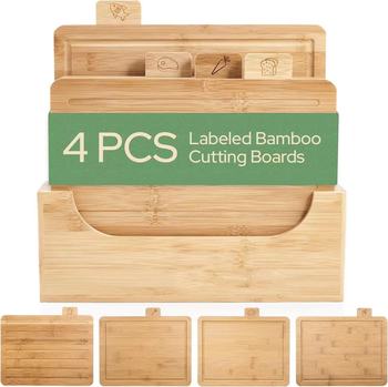 4ピース竹製カッティングボードセット収納スタンド付き | 魚/肉/果物/パン滑り止めスペース収納用